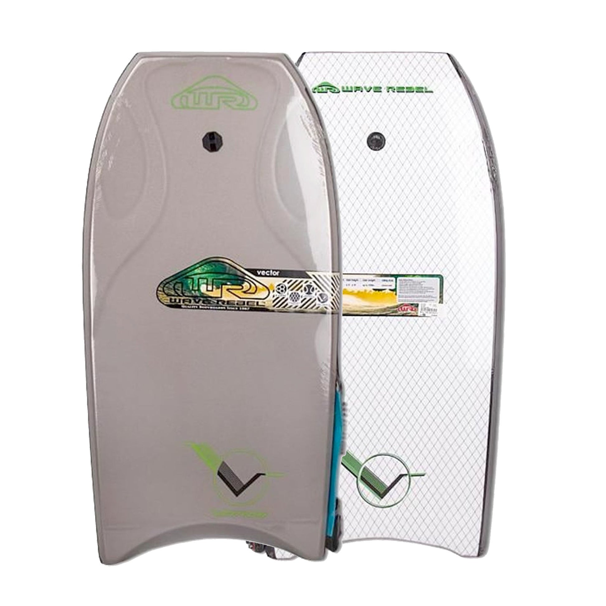 The Wave Rebel Vector 42" Grey Bodyboard features bottom channels, E-core, reinforcement mesh, body contour, and a coil leash!